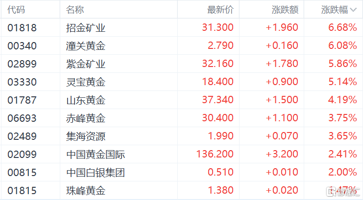 黄金股集体上涨,招金矿业、潼关黄金涨超6%,紫金矿业、灵宝黄金涨超5%,赤峰黄金、山东黄金、珠峰黄金跟涨。