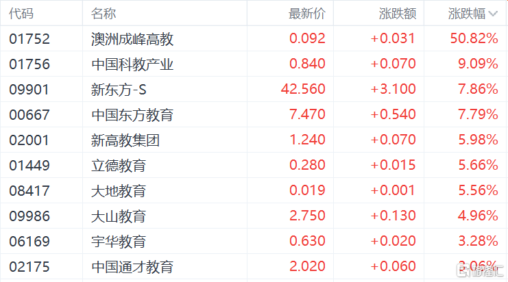 教育股上扬,澳洲成峰高教涨超50%领涨,中国东方教育涨超7%,新高教集团、大地教育涨超5%,宇华教育、中国通才教育、成实外教育跟涨。