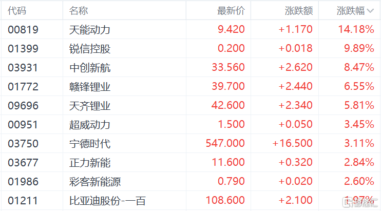 锂电池股上涨,天能动力涨14.18%,中创新航涨8.47%,赣锋锂业涨6.55%,天齐锂业涨5.81%。
