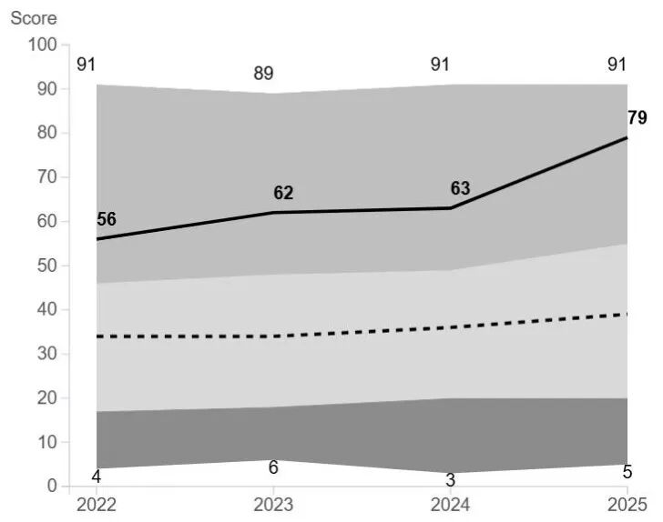 此次评估中,新奥能源在气候管治策略、人力资源管理、职业健康安全、公司管治、产品管理等领域的多项细分指标中获得提升。公司评分不仅较去年实现大幅提升,更远高于全球同业平均分,彰显了新奥能源在可持续发展管理实践方面的卓越成就。
