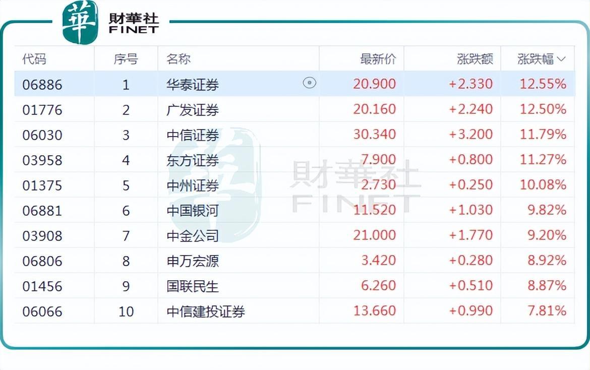 在港股市场,$华泰证券(HK6886)涨12.55%,$广发证券(HK1776)涨12.5%,$中信证券(HK6030)涨11.79%,东方证券(03958.HK)涨11.27%,中州证券(01375.HK)涨10.08%,中国银河(06881.HK)、中金公司(03908.HK)均涨超9%。