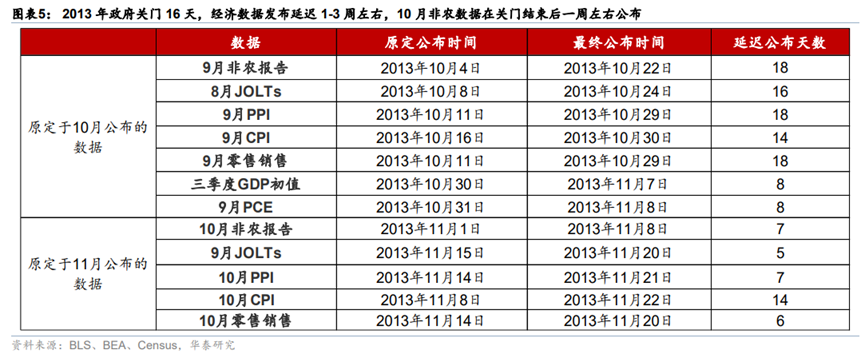 除就业市场外,政府关门还对美国经济增长产生直接拖累,且进一步加剧了核心经济数据发布的不确定性。按照原计划,本应在10月3日发布的非农就业数据、10月15日发布的消费者价格指数(CPI)等关键经济指标,目前已确定因停摆延迟。据华泰证券援引信息显示,美国劳工统计局(BLS)已明确表态,在政府关门期间将全面暂停数据收集与发布工作,这意味着一系列由政府主导的经济数据(如PPI、零售销售、GDP等)均将面临延迟发布风险。回顾2013年美国政府16天关门事件,当时10月计划公布的9月非农就业、CPI/PPI、零售销售、三季度GDP初值、个人消费支出(PCE)等数据均延迟1-3周发布,即便到11月公布10月数据时,延迟时间仍达1-2周,此次停摆若持续,或会重演类似的数据披露混乱。