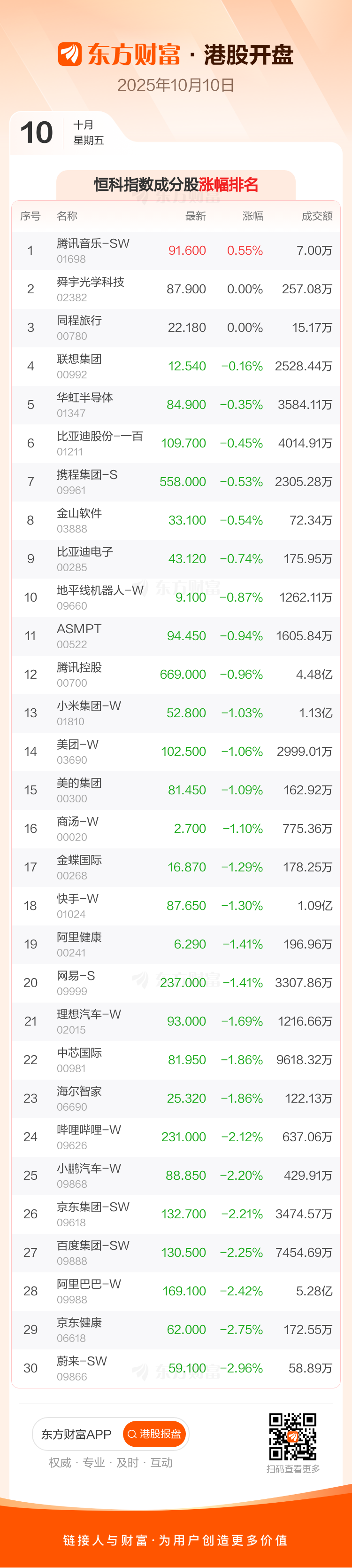 港股10月10日低开,恒生指数开盘报26523.89点,跌228.7点,跌幅0.85%;恒生科技指数开盘报6380.88点,跌90.46点,跌幅1.4%。恒生指数成分股中翰森制药、中国联通、康师傅控股涨幅居前,京东健康、阿里巴巴-W、百度集团-SW跌幅靠前。恒生科技指数成分股中腾讯音乐-SW、舜宇光学科技、同程旅行涨幅居前,蔚来-SW、京东健康、阿里巴巴-W跌幅靠前。