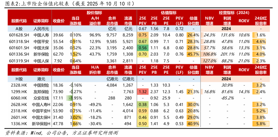 投资建议:维持行业推荐评级。估值方面:截至10/10收盘,当前A 股四家险企平均静态/动态PEV 0.72x/0.67x,均处于较低历史分位,下行风险小。资产端:权益市场回暖、长端利率缓慢回升,险企投资端预期有望逐步改善;负债端:储蓄险销售回暖、医改催化中高端医疗险需求释放、报行合一以及预定利率调整等有望推动NBVM提升,进而带动NBV稳健增长;大灾风险减弱助力COR显著改善,行业基本面趋势向好延续。强烈推荐:①寿险:投资弹性较大、业绩有望超预期的新华保险、经营持续回暖的中国平安、改革成效显著的中国太保、经营稳健的中国人寿。②财险:大灾风险减弱、风险治理成效显著的中国财险,财险驱动业绩改善的中国人保,以及业绩快速增长的众安在线。
