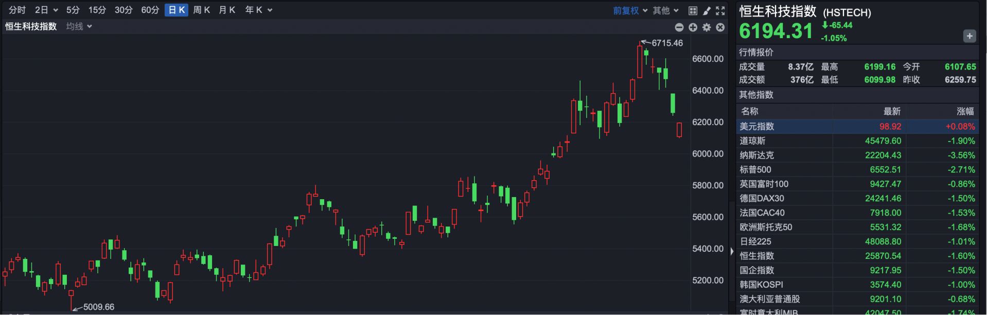 其他方面,盘面上,科网股开盘全线下跌,哔哩哔哩跌超5%,小米跌超4%,联想、阿里巴巴、腾讯、美团、快手、京东低开超3%,网易涨超3%;黄金股普涨,紫金黄金国际涨超4%;汽车股普跌,蔚来跌超4%;半导体板块走弱,晶门半导体低开超7%;创新药概念重挫,药明合联低开超5%。
