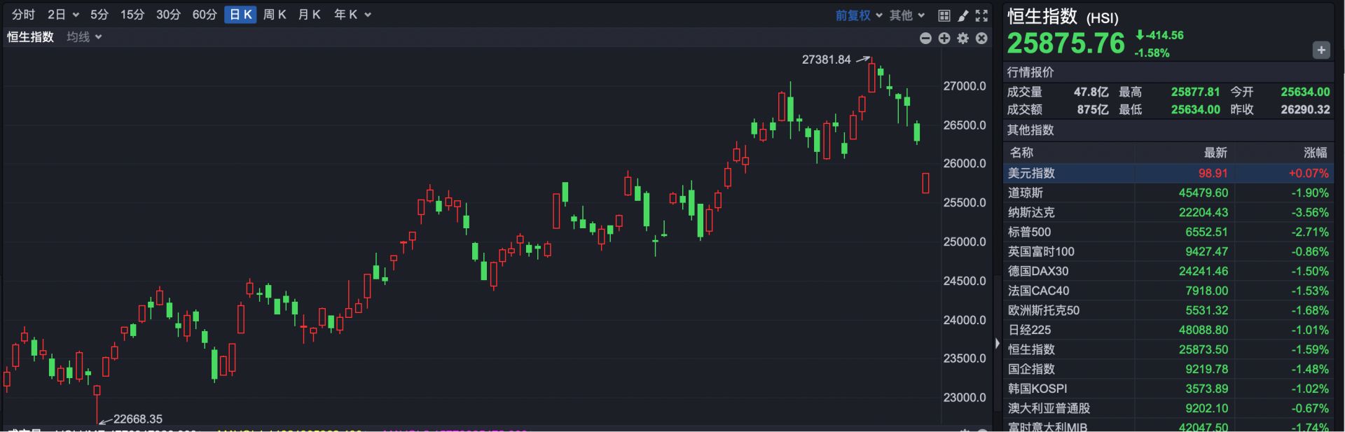 恒生指数开盘跌2.50%,报25634.00点,截至发稿时跌幅收窄至1.55%。