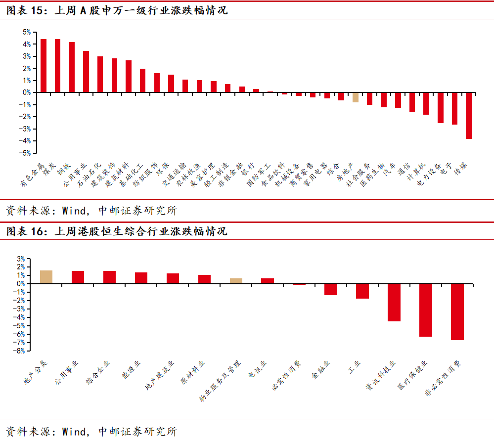 从行业排名来看,上周A股房地产在31个申万一级行业中排名第23,港股地产分类、物业服务及管理在14个恒生综合行业中分别排名第1、第7。