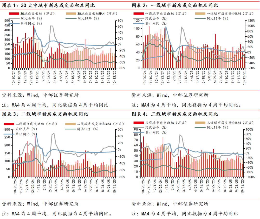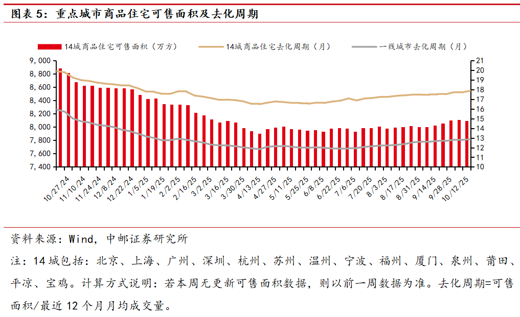 根据中指院数据,2025年1-9月,TOP100房企销售总额为26065.9亿元,同比下降12.2%,降幅较1-8月收窄1.1个百分点,9月单月,TOP100房企销售总额环比增长11.9%。“金九”延续企稳,但重点城市库存仍处高位,去化周期未见明显改善,高库存背景下,三四线城市销售同比持续低迷,成为拖累市场的主要因素。我们认为政策工具箱持续丰富,但全国性强刺激政策尚未出台,市场对后续"银十"专项政策仍有期待。