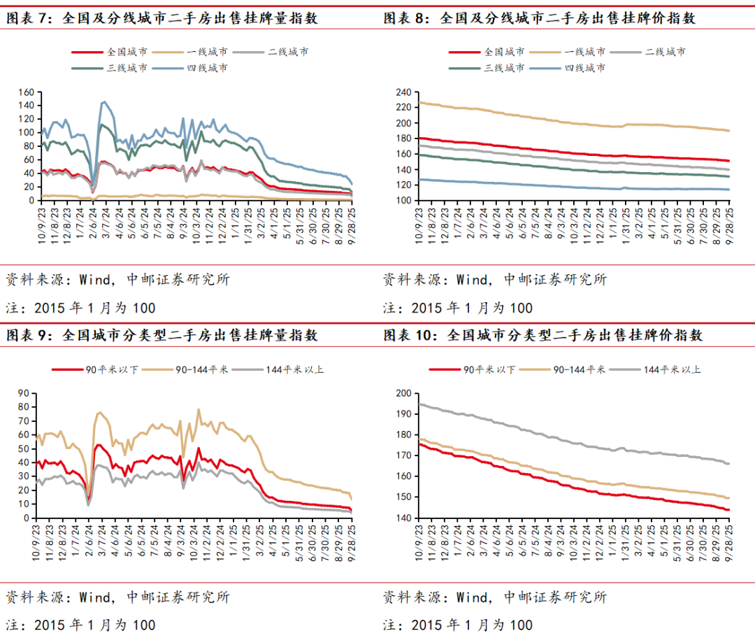 截至2025/9/29全国城市二手房出售挂牌量指数为7.51,环比-29.1%,挂牌价指数为150.87,环比-0.15%。