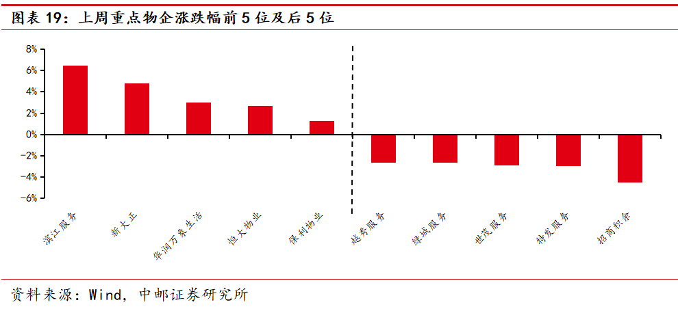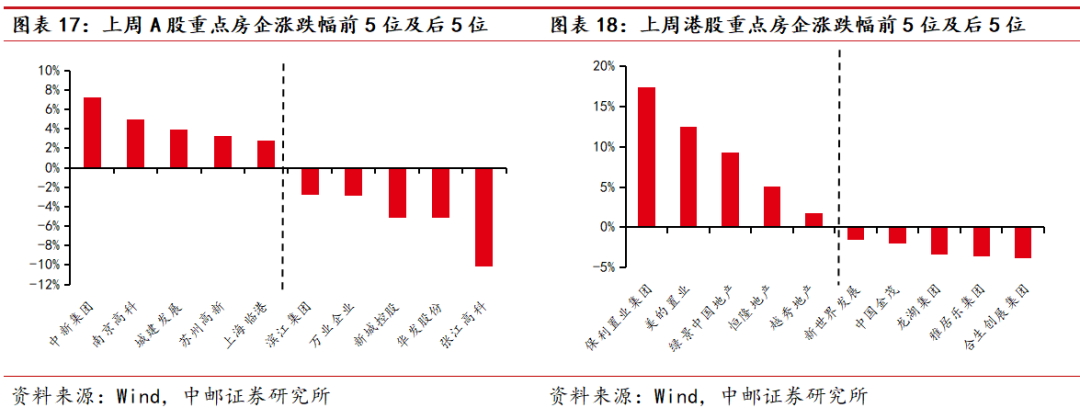 上周重点A股房地产个股涨幅居前的分别为:中新集团(+7.26%)、南京高科(+4.96%)、城建发展(+3.96%),重点港股房地产个股涨幅居前的分别为:保利置业集团(+17.37%)、美的置业(+12.5%)、绿景中国地产(+9.24%),重点物业服务企业涨幅居前的分别为:滨江服务(+6.44%)、新大正(+4.8%)、华润万象生活(+3.02%)。