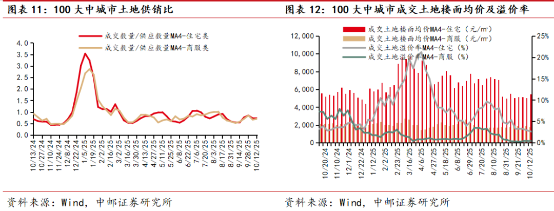 (3)土地市场成交:上周100大中城市新增供应住宅类土地数量为61宗,成交住宅类土地数量为39宗,新增供应商服类土地数量为43宗,成交商服类土地数量为48宗。近四周100大中城市平均住宅类土地成交数量/供应数量为0.74,平均商服类土地成交数量/供应数量为0.7。近四周100大中城市成交住宅类土地楼面均价为5466元/平方米,溢价率为2.58%,环比-0.28pct,成交商服类土地楼面均价为1797.5元/平方米,溢价率为0.37%,环比-0.05pct。