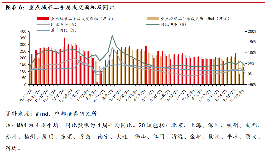 (2)二手房成交及挂牌:上周20城二手房成交面积为134.71万方,本年累计二手房成交面积为8644.06万方,累计同比+14.4%。20城近四周平均成交面积为165.98万方,同比+7%,环比-10.2%。截至2025/9/29全国城市二手房出售挂牌量指数为7.51,环比-29.1%,挂牌价指数为150.87,环比-0.15%。