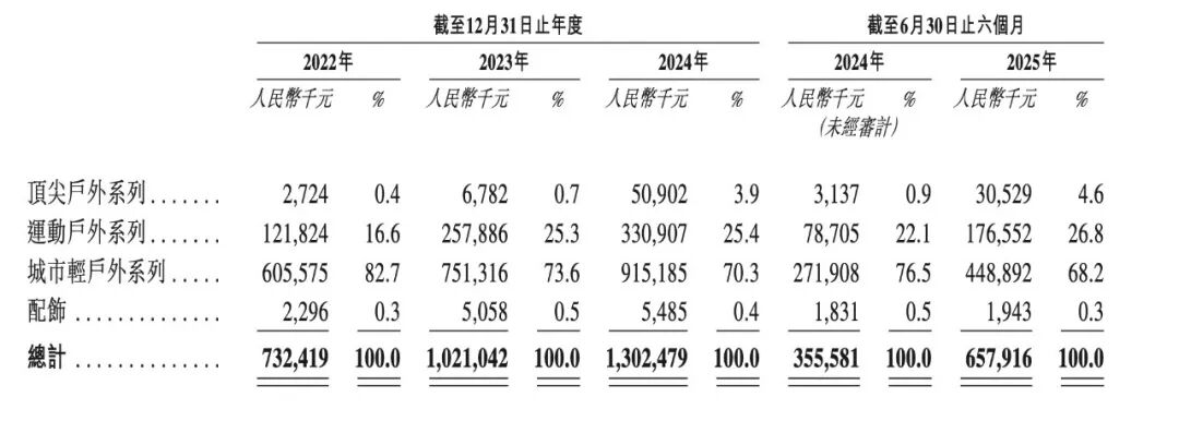 以坦博尔为例,2004年,坦博尔推出城市轻户外系列,定价699元至1799元,这也是坦博尔目前最受欢迎的系列,2025年上半年,城市轻户外系列的收入约4.49亿元,占收入比重达68.2%。