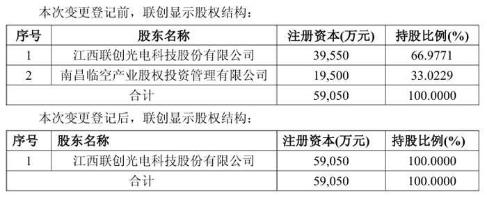 公告显示,联创显示已完成工商变更登记及《公司章程》备案,并取得南昌市行政审批局换发的新《营业执照》。本次工商变更前后,联创显示的股权结构发生根本性变化。变更前,联创光电持股 66.9771%、临空产业投资公司持股 33.0229%,为 “控股 + 少数股东” 模式;变更后,股权集中度显著提升,具体对比如下: