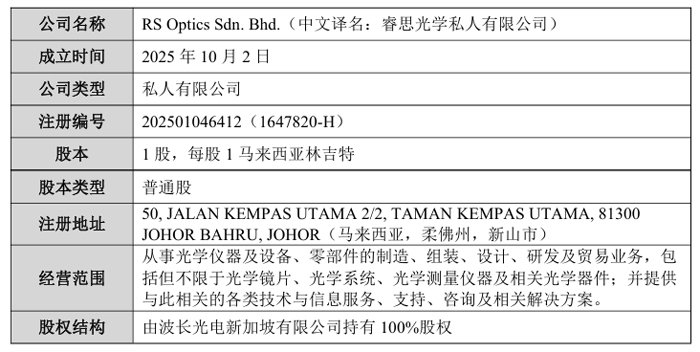 近日,南京波长光电科技股份有限公司(证券代码:301421,证券简称:波长光电)发布公告,宣布其全资子公司波长光电新加坡有限公司(下称 “新加坡波长”)已在马来西亚成功设立全资子公司 —— 睿思光学私人有限公司(RS Optics Sdn. Bhd.,下称 “睿思光学”),并完成了当地公司委员会(SSM)的设立注册登记,标志着公司境外战略布局进一步落地。