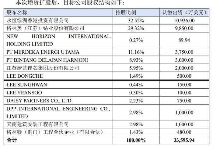 公告显示,本次增资扩股的目标公司成立于 2023 年 11 月,注册资本原为 9939.94 万美元,增资后将增至 33595.94 万美元,股权结构由 “格林美系” 全资持股转为多方法人共同持股。其中,蔚蓝锂芯以现金方式(资金来源为自有或自筹资金)认购 2000 万股普通股,对应持股比例 5.95%。