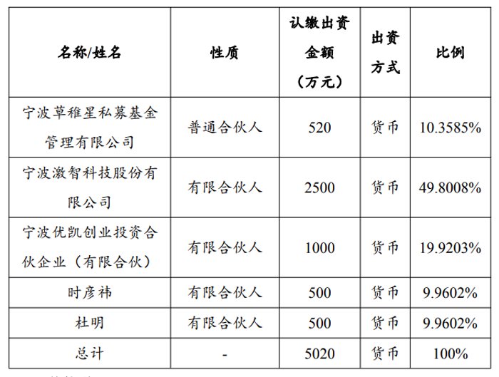 从各合伙人认缴出资结构来看,基金出资方涵盖专业机构、上市公司及自然人,具体分配如下:作为普通合伙人的宁波草稚星私募基金管理有限公司认缴出资 520 万元,占比 10.3585%,承担基金管理职责;激智科技作为有限合伙人,以 2500 万元认缴金额占据 49.8008% 的出资比例,为基金第一大有限合伙人;此外,宁波优凯创业投资合伙企业(有限合伙)、自然人时彦祎及杜明分别以 1000 万元、500 万元、500 万元认缴出资,对应出资比例为 19.9203%、9.9602%、9.9602%,各方均以货币形式完成出资。