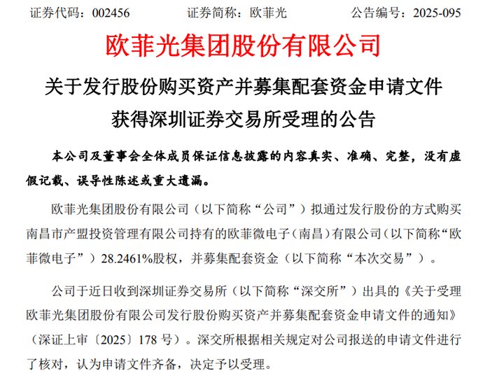 近日,欧菲光集团股份有限公司(证券代码:002456,证券简称:欧菲光)发布《关于发行股份购买资产并募集配套资金申请文件获得深圳证券交易所受理的公告》(公告编号:2025-095),宣布公司拟推进的发行股份购买资产并募集配套资金事项取得关键进展 —— 深圳证券交易所(以下简称 “深交所”)已正式受理相关申请文件。