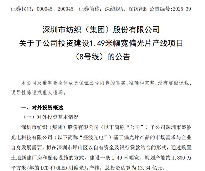 10 月 15 日,深圳市纺织 (集团) 股份有限公司(证券代码:000045、200045,简称 “深纺织 A”)发布公告,旗下子公司深圳市盛波光电科技有限公司拟在深圳坪山区投资建设 1.49 米幅宽偏光片产线(8 号线),总投资估算 13.34 亿元,规划年产能约 1800 万平方米,旨在缓解产能瓶颈,强化高附加值产品供应能力。