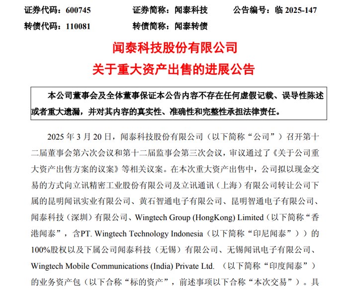 回溯本次重大资产出售进程,自 2025 年 3 月启动以来,闻泰科技已按法定程序完成多轮关键决策:3 月 20 日,公司第十二届董事会第六次会议及第十二届监事会第三次会议审议通过重大资产出售方案,明确拟以现金交易方式,向立讯精密工业股份有限公司及立讯通讯(上海)有限公司转让旗下多家子公司股权及业务资产包 —— 具体包括昆明闻讯实业有限公司、黄石智通电子有限公司、昆明智通电子有限公司、闻泰科技(深圳)有限公司、Wingtech Group (HongKong) Limited(含其下属 PT. Wingtech Technology Indonesia)100% 股权,以及闻泰科技 (无锡) 有限公司、无锡闻讯电子有限公司、Wingtech Mobile Communications (India) Private Ltd. 的业务资产包。