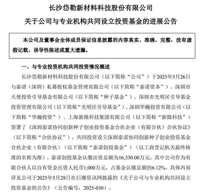据悉,岱勒新材早在 2025 年 5 月 26 日便已联合多方专业机构启动基金设立工作。当时公司与泰诺(深圳)私募股权基金管理有限公司(下称 “泰诺资本”)、深圳市天使投资引导基金有限公司(下称 “种子基金”)、深圳市光明区引导基金投资管理有限公司(下称 “光明区引导基金”)、深圳华瀚投资有限公司(下称 “华瀚投资”)及上海新微科技集团有限公司(下称 “新微科技”)共同签署《合伙协议》,拟联合设立泰诺创投基金。根据协议约定,该基金认缴出资总额为 16330.00 万元,其中岱勒新材作为有限合伙人,以自有资金出资 1000 万元,占基金认缴总额的 6.12%。