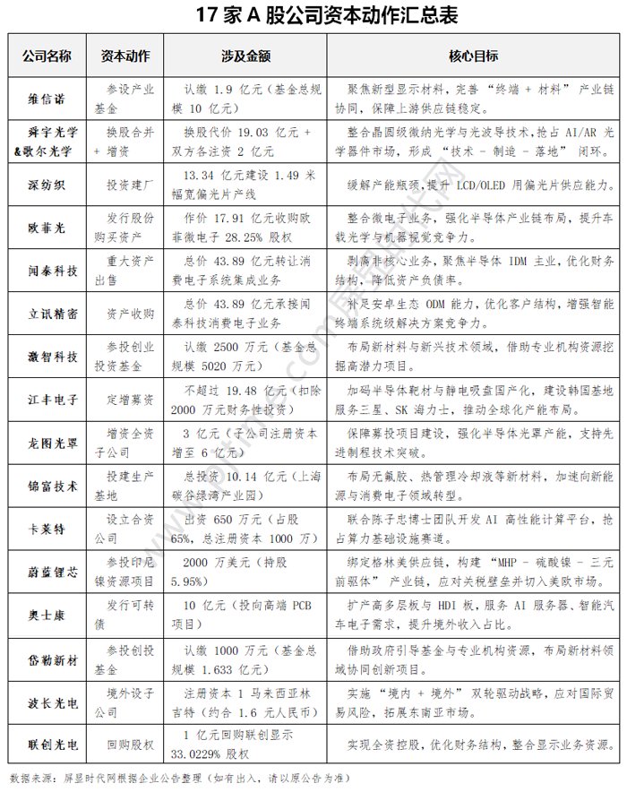 2025 年 10 月中旬,A 股资本市场迎来一波 “产业 + 资本” 联动热潮。维信诺、闻泰科技、立讯精密、舜宇光学、歌尔光学、深纺织、联创光电、波长光电、欧菲光、激智科技、江丰电子、龙图光罩、锦富技术、卡莱特、蔚蓝锂芯、奥士康、岱勒新材等 17家上市公司集中披露投资、并购、海外设厂、定增募资等关键动作,涉及金额从数千万元到数十亿元不等,覆盖新型显示材料、AI/AR 光学器件、半导体核心材料、新能源镍资源等多个高景气赛道。