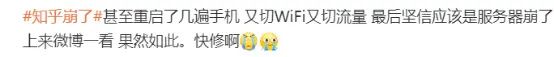 更“硬核”的用户直接把问题归到手机上,连着重启好几次设备,直到刷到微博热搜才恍然大悟:“原来不是我的问题,是知乎崩了!”