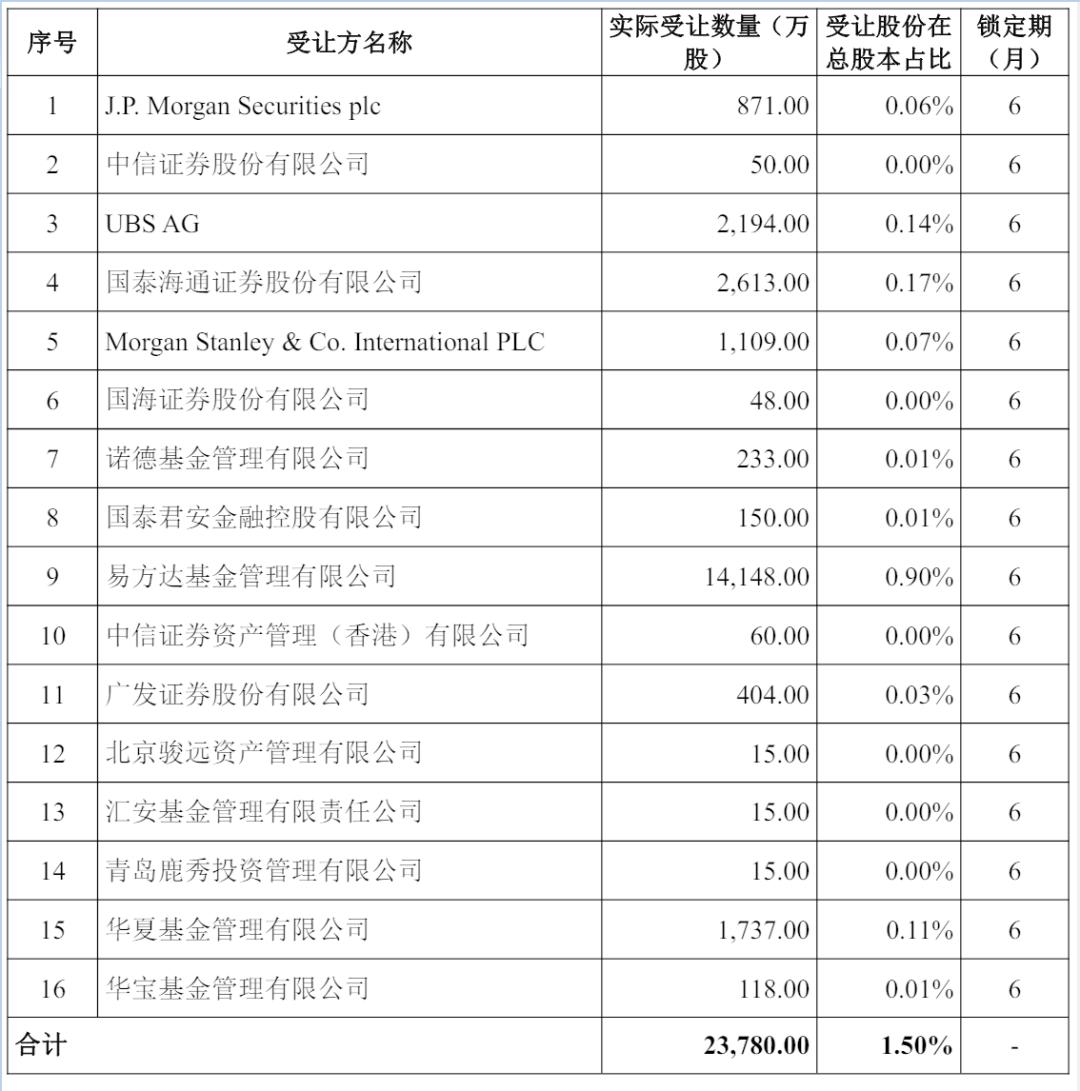 一共有16名机构投资者入围,分别为J.P. Morgan Securities plc、中信证券股份有限公司、UBS AG、国泰海通证券股份有限公司、Morgan Stanley & Co. International PLC、国海证券股份有限公司、诺德基金管理有限公司、国泰君安金融控股有限公司、易方达基金管理有限公司、中信证券资产管理(香港)有限公司、广发证券股份有限公司、北京骏远资产管理有限公司、汇安基金管理有限责任公司、青岛鹿秀投资管理有限公司、华夏基金管理有限公司、华宝基金管理有限公司。