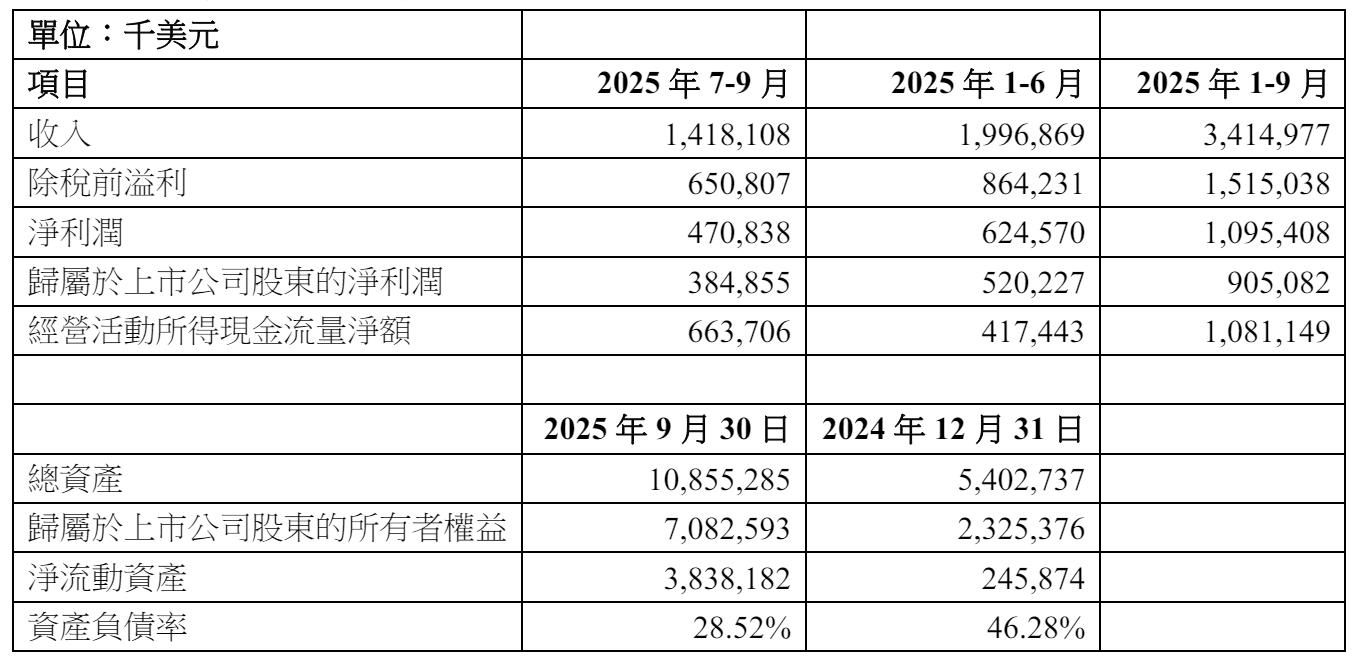 其中,紫金黄金2025年第三季度营收为14.18亿美元,净利润为4.71亿美元,归属于上市公司股东的净利润为3.85亿美元。紫金黄金2025年第三季度经营活动所得现金流量净额为6.64亿美元。