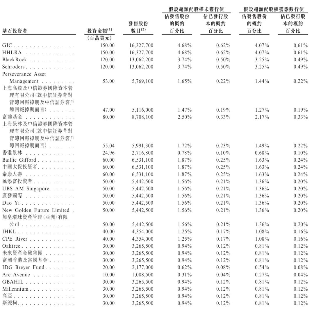 其中,GIC、高瓴HHLRA分别认购1.5亿美元,BlackRock、Schroders分别认购1.2亿美元,Perseverance Asset Management认购5300万美元,高毅资产认购4700万美元,富达基金认购8000万美元,景林认购2496万美元;