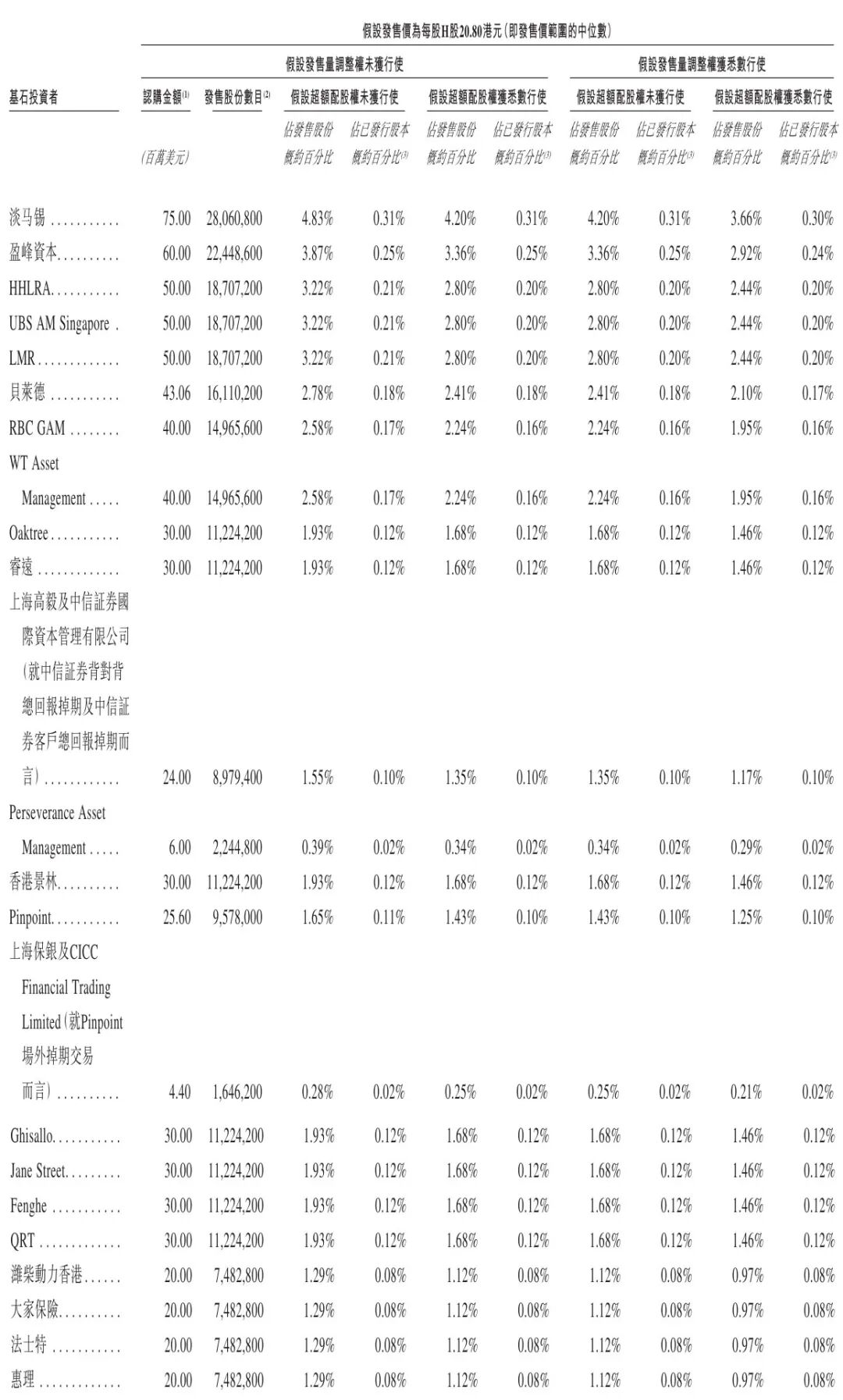 Perseverance Asset Management认购600万美元,香港景林认购3000万美元,Pinpoint认购2560万美元,上海保银及CICC Financial Trading认购440万美元,Ghisallo、Jane Street、Fenghe、QRT分别认购3000万美元,潍柴动力香港、大家保险、法士特、惠理分别认购2000万美元。