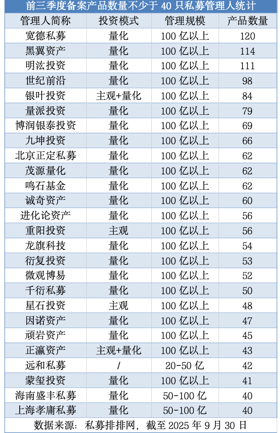 据私募排排网统计,前三季度,百亿量化私募宽德私募以120只的备案产品数量居于行业首位。紧随其后的是黑翼资产、明汯投资、世纪前沿,备案产品数量分别为114只、111只和98只,这3家均为百亿量化私募管理人。