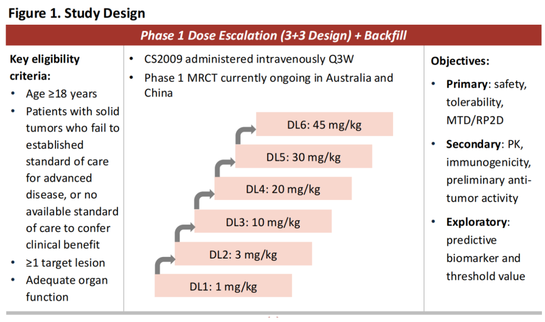 从入组患者的肿瘤类型上,CS2009的I期研究不仅入组了像非小细胞肺癌(NSCLC)这种大适应症和热肿瘤患者,还覆盖了相当一部分的冷肿瘤患者(包括10位卵巢癌患者、9位软组织肉瘤患者)。