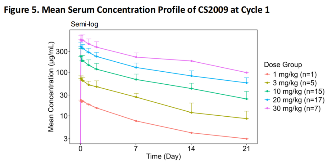 从PK入手,CS2009的终末半衰期是6-8天,这支持了每3周一次用药(Q3W)的给药方案,同时多次给药无明显积蓄的特性,代表CS2009拥有极高的治疗安全窗口、更可控的疗效和更简便的临床管理。