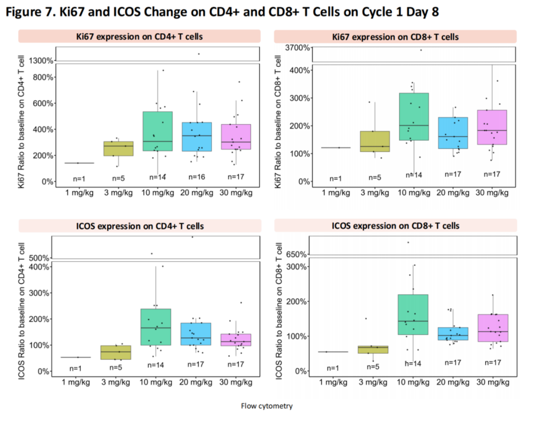 2)随着CS2009剂量上调,T细胞激活与增殖标志物(Ki67与ICOS)呈剂量依赖性上调,T细胞正在活跃地分裂和扩增,且T细胞接受了持续的激活信号和功能得到强化;