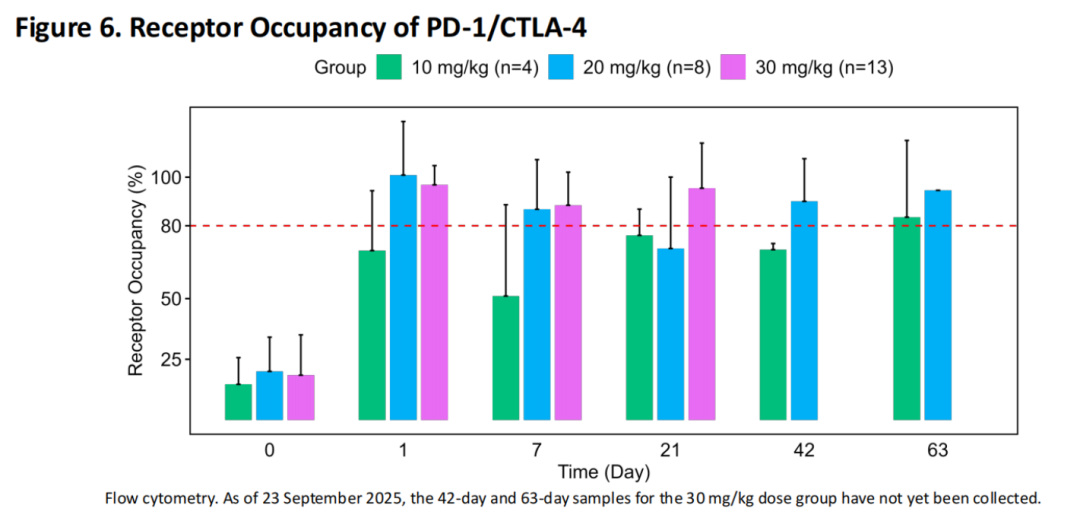 1)当CS2009剂量达到或超过20mg/kg时,PD-1/CTLA-4受体占有率均超过80%,这意味着CS2009实现了最大程度的PD-1/CTLA-4双阳性细胞的靶点抑制,且T细胞识别和杀伤肿瘤能力得到最大程度的释放;