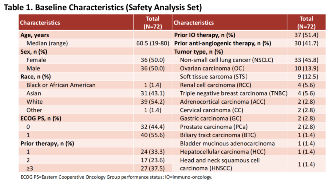 试验入组的72位患者中,既往接受过IO治疗的患者高达51.4%,既往接受抗血管生成治疗的患者比例41.7%,几乎100%符合免疫检查点抑制剂/抗血管生成疗法条件的患者在入组前都接受过相应治疗。