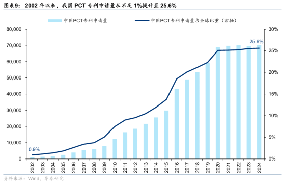 据华泰证券统计,我国PCT专利申请量占全球比重从2002年的不足1%提升至2024年的25.6%,每万人口高价值发明专利拥有量达到14件,提前完成国家“十四五”规划的预期目标;在高铁、5G、新能源、数字支付等领域在全球处于领先地位,从技术接受方转向技术提供方甚至标准制定者。