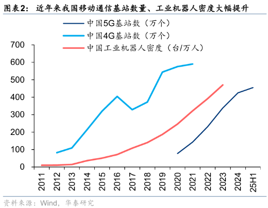 我国是世界上唯一拥有联合国产业分类目录中全部工业门类的国家,在经济总量稳健增长的过程中制造业比重相对稳定,据华泰证券统计,2024年,我国制造业增加值占全球比重从2004年的8.6%提升至27.7%,占国内GDP的比重维持在25%左右(24.9%),制造业规模连续15年位居世界第一;同时,我国的信息化、数字化、智能化程度持续提升,移动通信基站数量、工业机器人密度大幅提升。