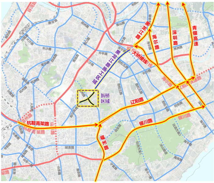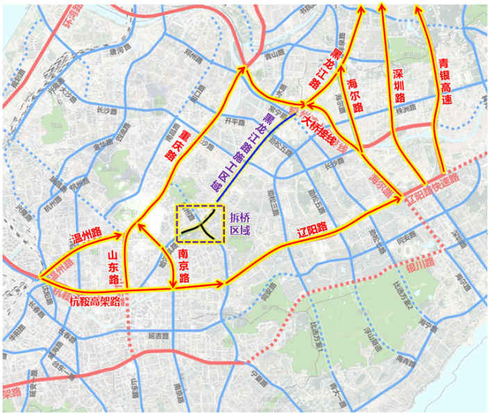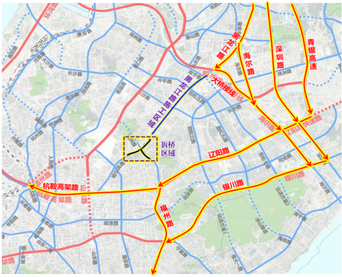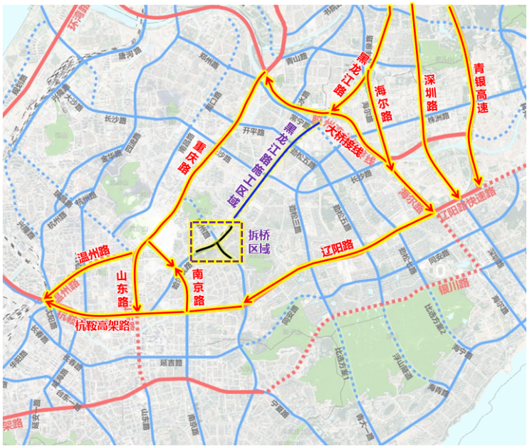 ③由黑龙江路经华仁桥驶往哈尔滨路车辆:提前经黑龙江路-跨海大桥接线、海尔路、深圳路、青银高速绕行,至辽阳路-杭鞍高架路、重庆路-山东路/温州路向西通行。