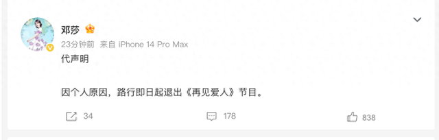 10月24日,女演员邓莎发文“代声明”,因个人原因,路行即日起退出《再见爱人》节目。