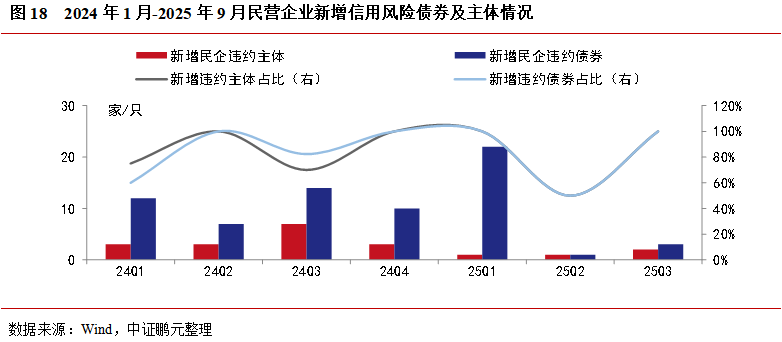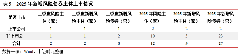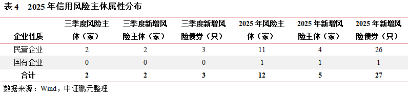从发行人类型看,2025年三季度新增的2家风险主体均为民营企业,细分看,中装股份为民营上市公司,正兴隆地产为外商独资非上市公司。2025年1-9月,民营企业新增风险主体4家,占比80%;新增上市公司风险主体2家,占比40%。