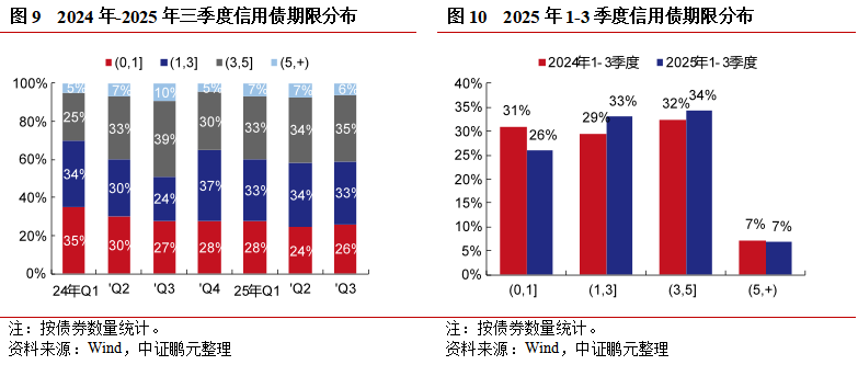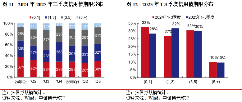 2025年三季度,1年期以下短期债券发行数量占比25.9%、发行规模占比29.9%,较去年同期分别下降1.6百分点和增长1.8个百分点;1-3年期(含)发行数量占比33.8%、发行规模占比32.2%,较去年同期分别上升9.1个百分点和9.2个百分点;3-5年期(含)发行数量占比34.8%、发行规模占比30.7%,较去年同期分别下降4.4个百分点和5.6个百分点;5年期以上发行数量占比6.5%、发行规模占比7.2%,较去年同期分别下降3.1个百分点和5.1个百分点。