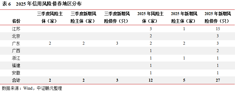 从地区分布看,2025年三季度新增的2家风险主体均位于广东。2025年1-9月,累计有8个省份发生风险事件,其中新增风险主体分布在江苏、广州和浙江。
