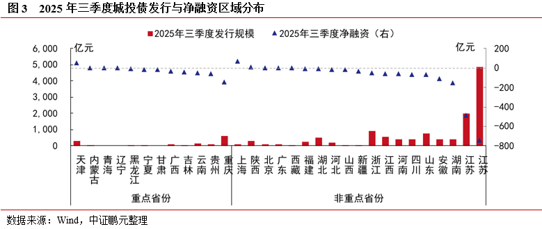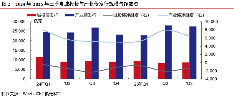 2025年三季度,城投债发行规模8,732亿元,同比下降5.4%,占信用债总发行规模比例为24.2%,净偿还1,335亿元,较去年同期的净偿还收窄979亿元;产业债发行规模27,356亿元,同比下降1.4%,净融资规模6,585亿元,同比增长27.5%。