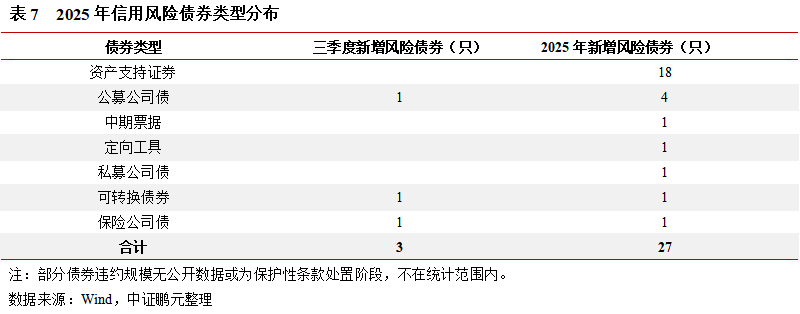 从债券类型看,三季度新增风险债券分布在公募公司债和可转换债券。2025年1-9月,新增风险债券中资产支持证券违约数量最多,有18只,占比66.7%,实际债务人包括苏宁易购、苏宁电器、厦门宝龙实业有限公司、中国泛海控股集团有限公司等。可转债发行主体主要为中小上市公司,近年来经营压力和偿债压力上升,部分企业采用破产程序以实现保壳和持续经营。例如,中转股份。