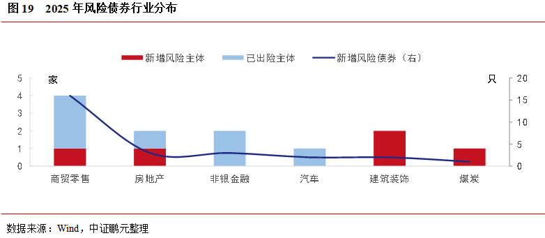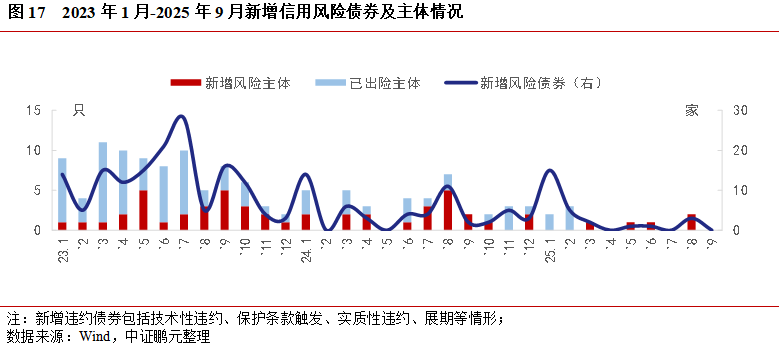 从行业看,2025年三季度风险债券集中在房地产行业和建筑装饰行业,分别新增1家风险主体。地产行业风险外溢的影响依然存在,主要是建筑装饰行业。2025年1-9月,新增的5家风险主体分布在建筑装饰、煤炭、房地产和商业贸易行业,其中建筑装饰2家,其余行业各1家。