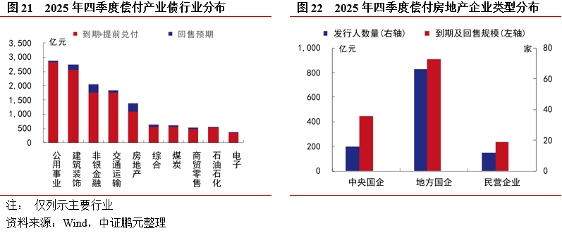 产业债方面,2025年四季度总体偿付债券规模预计约1.65万亿元,环比下降20.6%,同比下降9.5%。其中,到期和提前兑付规模预计1.51万亿元、回售规模预计1,373亿元。