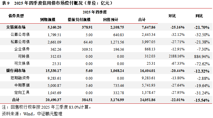 2025年四季度非金融企业信用债总偿付规模预计为2.41万亿元,环比下降22.0%,同比下降15.5%。其中,到期规模预计2.05万亿元、提前兑付预计385元,进入回售期的债券余额4,985亿元,按前三季度的63.7%回售率计算,回售规模预计3,177亿元。不考虑短期融资券,中长期债券偿付规模预计约1.48万亿元,环比下降26.4%,同比下降21.9%。