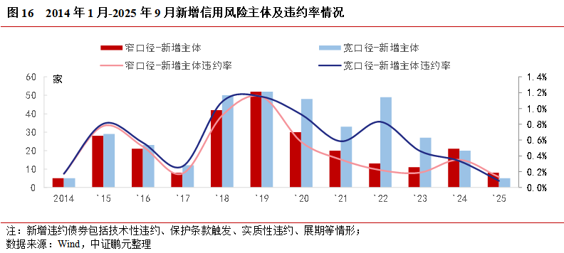 宽口径下[2],2025年三季度新增风险债券(含已违约主体)3只,同比下降80%,涉及风险主体2家,均为新增风险主体(即首次出险),且均发生在8月。宽口径下[3],截至2025年9月末,本年新增主体违约率由2024年末的0.33%下降至0.08%;窄口径下,2025年违约率下降至0.13%,主要是部分前期已出险主体未能如期兑付。例如,苏宁电器集团有限公司、广州富力地产股份有限公司和旭辉集团股份有限公司,以及天安财产保险股份有限公司(简称“天安财险”)。其中,天安财险于2020年7月被原银保监会接管,后延长接管期限。依据监管要求,本期债券应在“确保偿还本息后偿付能力充足率不低于100%,且有能力清偿其他负债的本金和利息的前提下”予以偿付,截至2025年9月30日,公司不能确保在偿付本期债券本息后的偿付能力充足率不低于100%且有能力清偿其他负债的本金和利息,因此未能兑付本息,成为首只未能到期兑付的保险次级债。我们认为,虽然该兑付事项符合募集说明书约定,但同时反映了发行人极大的兑付压力,故纳入风险债券。